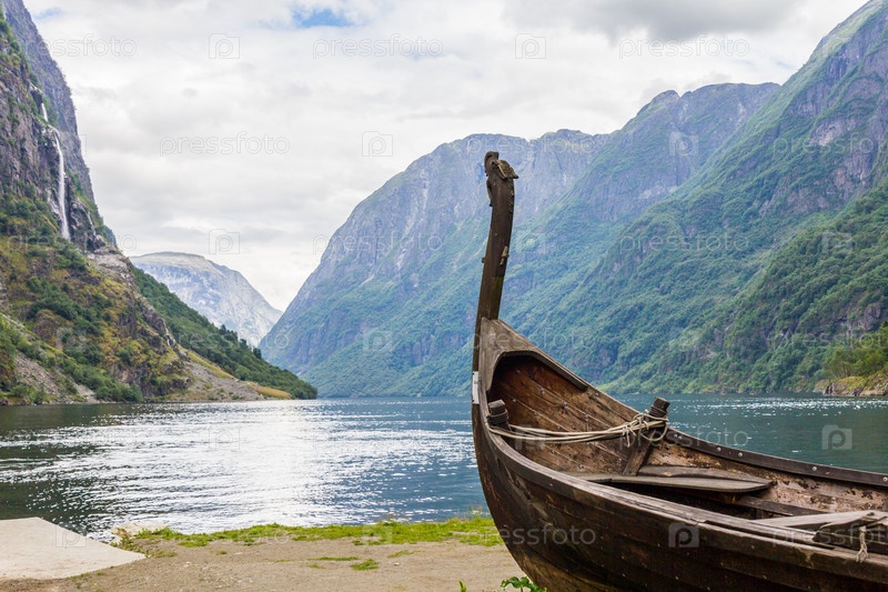 Драккар викингов в Согнефьорде между Фламом и Гудвангеном в Норвегии