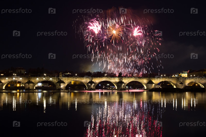 Красочный фейерверк. Исторический центр Праги. Чешская Республика