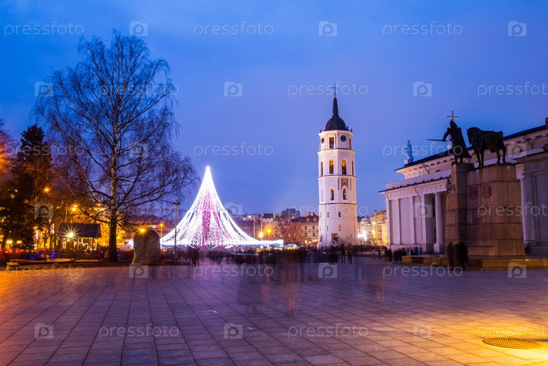 Ночной вид центральной площади, колокольни и собора Святых Станислава и Владислава на канун нового года