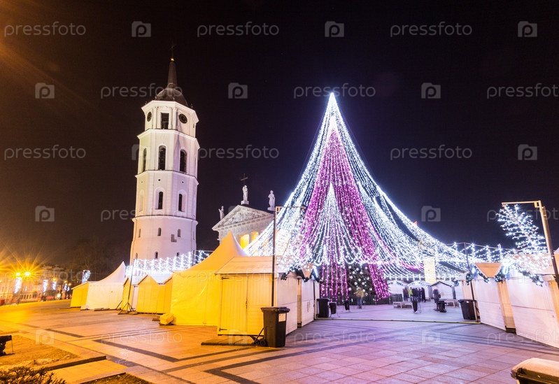 Ночной вид центральной площади, колокольни и собора Святых Станислава и Владислава на канун нового года