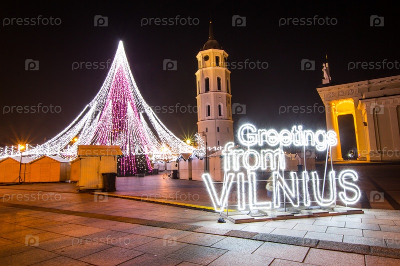 Ночной вид центральной площади, колокольни и собора Святых Станислава и Владислава на канун нового года