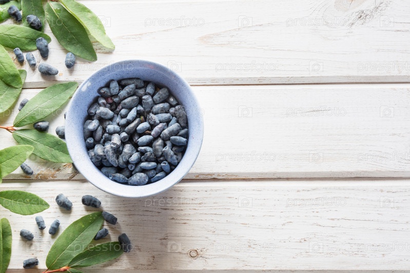 Спелые ягоды жимолости на деревянном фоне. Летний урожай