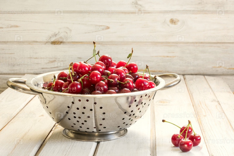Металлический дуршлаг полный свежесобранной вишни