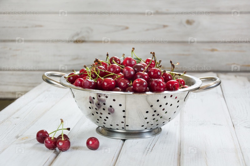 Металлический дуршлаг полный вишни