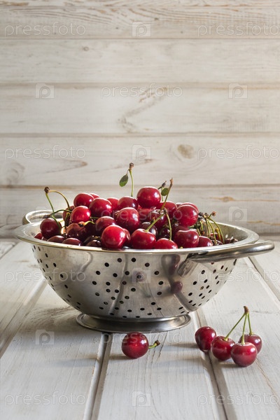 Металлический дуршлаг полный вишни