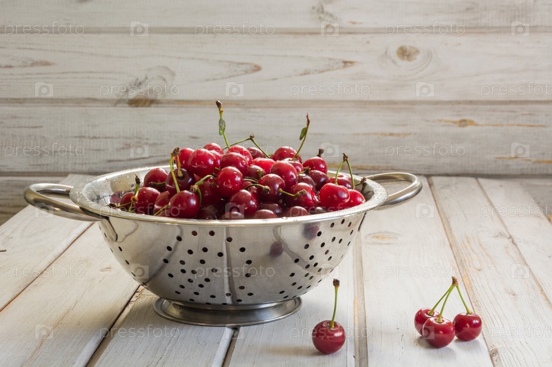 Металлический дуршлаг полный вишни