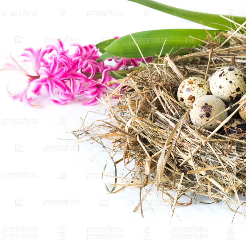 Концепция Пасхи. Розовый гиацинт и гнездо сена с перепелиными яйцами