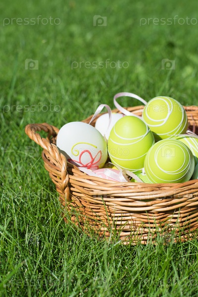 Окрашенные яйца с лентой на зеленой траве