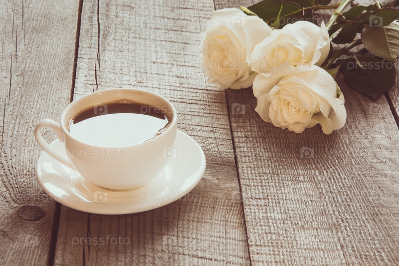 Белые розы с чашкой черного кофе