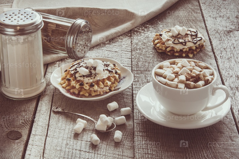 Белая чашка кофе с молоком, зефиром и домашними вафлями со взбитыми сливками