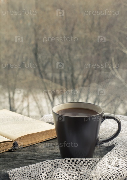 Чашка черного кофе с молоком и книга