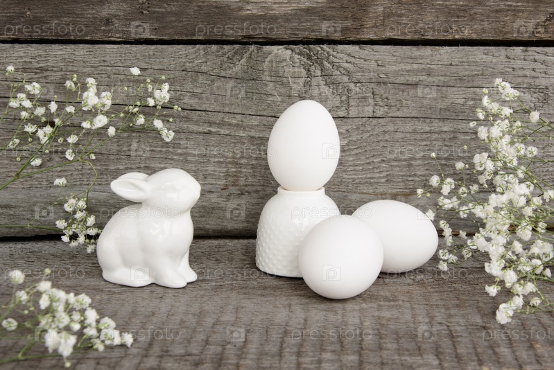 Белый кролик и яйцо на старинном деревянном фоне. Пасха