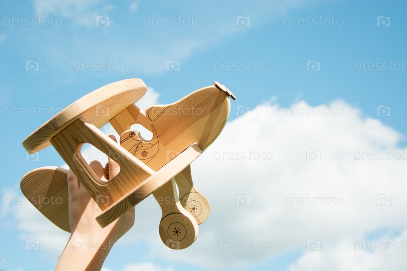 Игрушка самолет в руке и голубое облачное небо