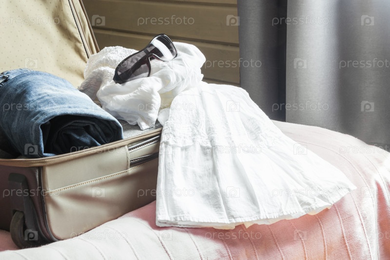Открытый чемодан с женской одеждой на кровати