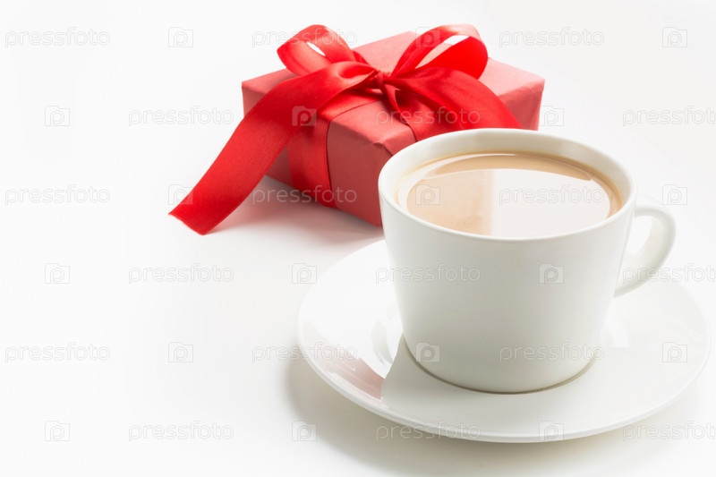 Белая чашка черного кофе с молоком и красным подарком на белом фоне