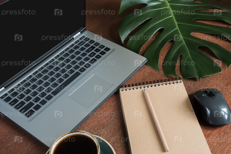 Рабочее место с открытым ноутбуком и чашкой кофе