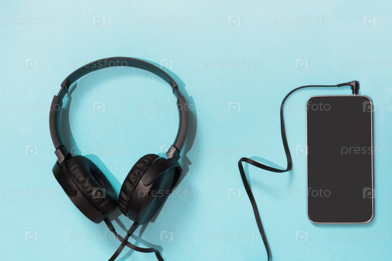 Современные черные наушники и смартфон на синем фоне