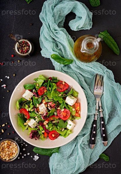 Диетический салат с помидорами, фета, салатом, шпинатом и кедровыми орехами