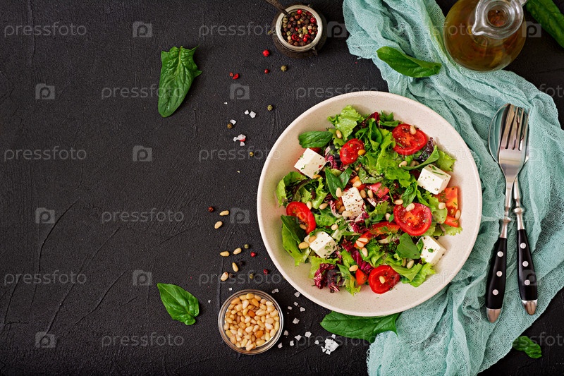 Диетический салат с помидорами, фета, салатом, шпинатом и кедровыми орехами