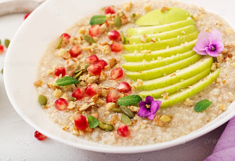 Вкусная и здоровая овсяная каша с яблоками, гранатом и орехами