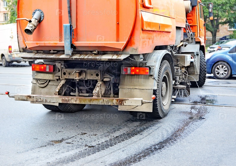 Фрагмент поливочной машины на оживленной улице