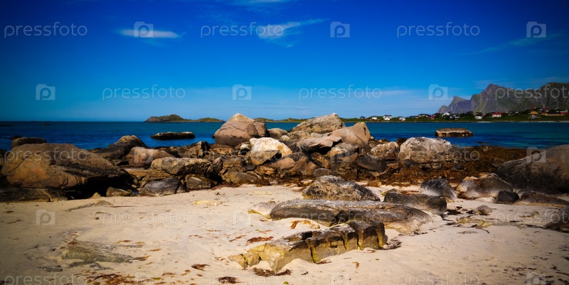 Залив и пляж Jusnesvika Rambergstranda на острове Флакстадей, Лофотенские острова, Норвегия
