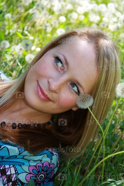 Девушка лежит на траве среди одуванчиков