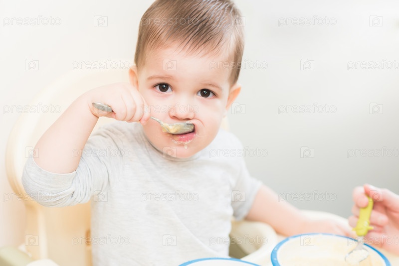 Мама кормит ребенка молочной кашей
