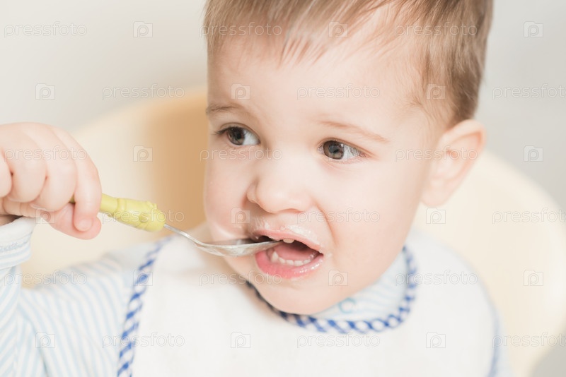 Ребенок на кухне ест молочную кашу