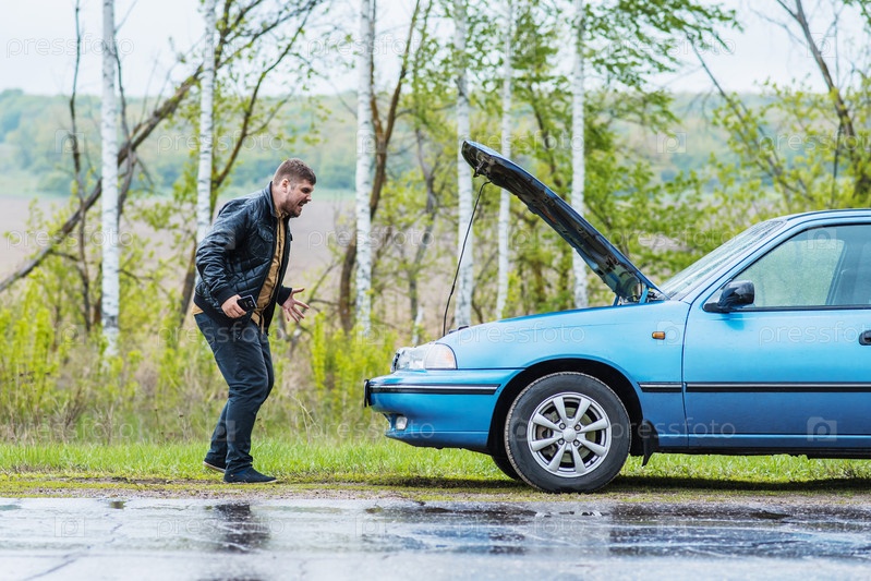 Нервный водитель со сломанным автомобилем