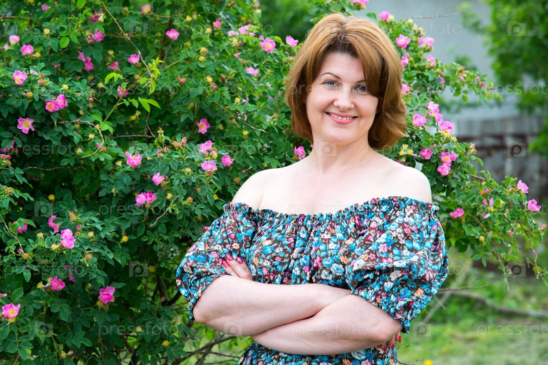 Женщина возле цветущего шиповника