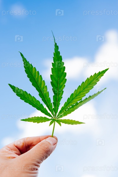 Парень держит лист конопли в руке