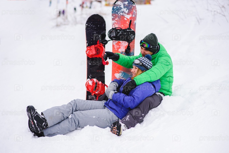 Пара сноубордистов позируют для фотографии