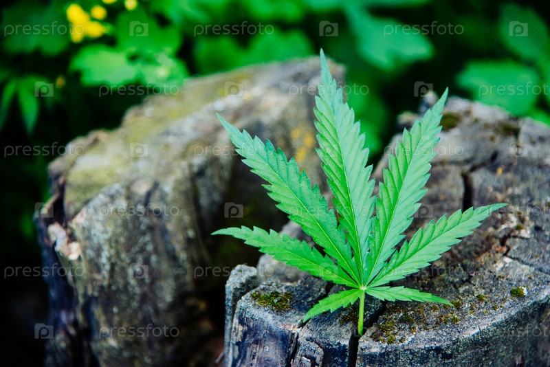 Свежий лист конопли лежит на пне