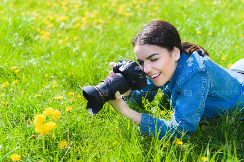Привлекательная девушка на лугу фотографирует цветы