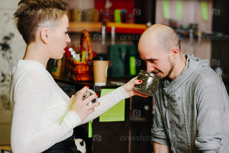 Продавец предлагает понюхать чай клиенту