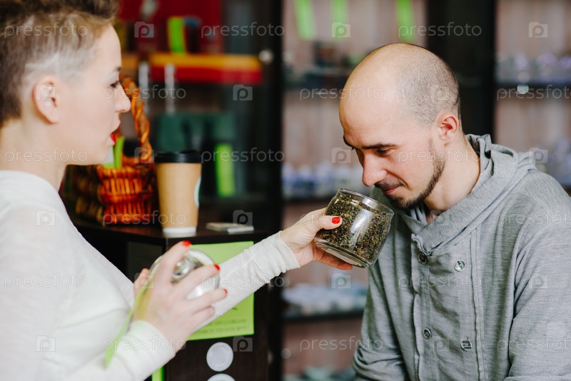 Продавец предлагает понюхать чай клиенту