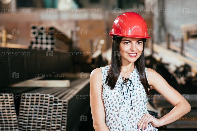 Красивая девушка на складе рекламирует товары