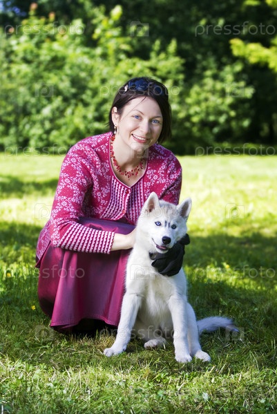 Женщина с щенком хаски на траве