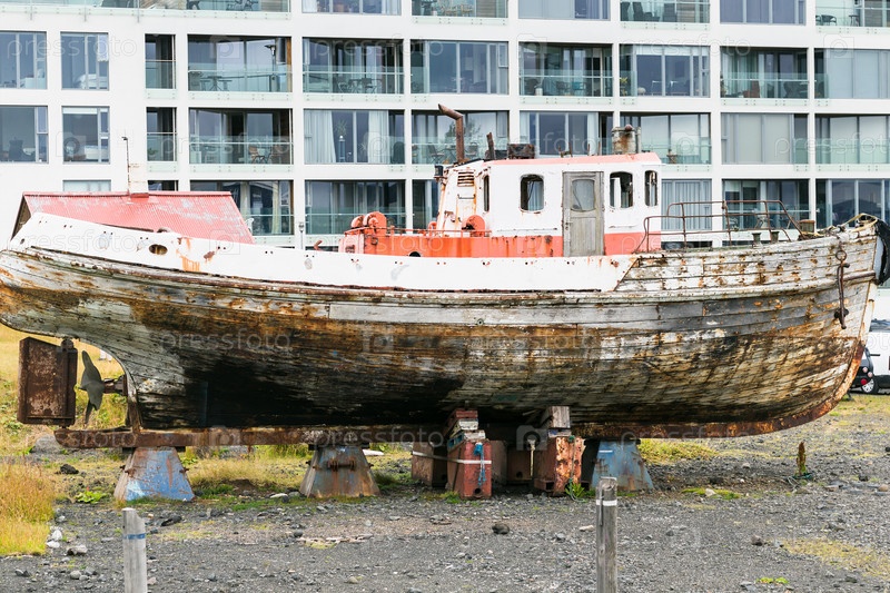 Старая лодка на улице в городе Рейкьявик