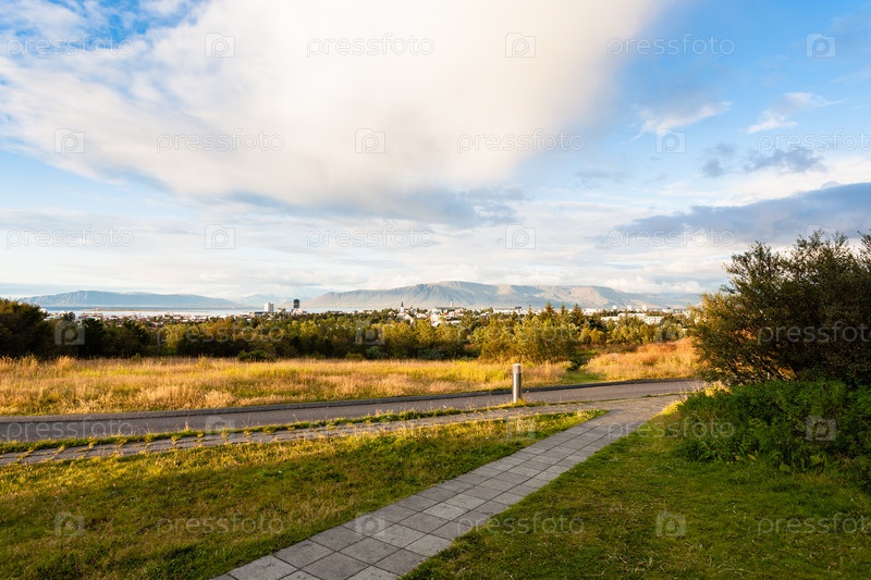 Дороги на горе Оксюлид и вид на город Рейкьявик