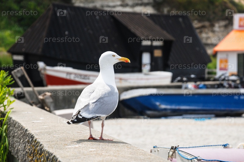 Чайка на каменном парапете городского пляжа