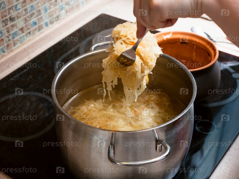 Повар кладет квашеную капусту в кастрюльку