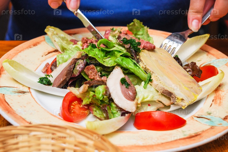 Посетитель ест салат с нормандскими мясными закусками