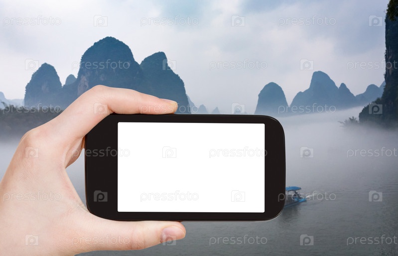 Турист фотографирует лодки в тумане в Яншо