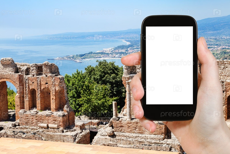 Турист фотографирует Театро Греко и Ионическое море
