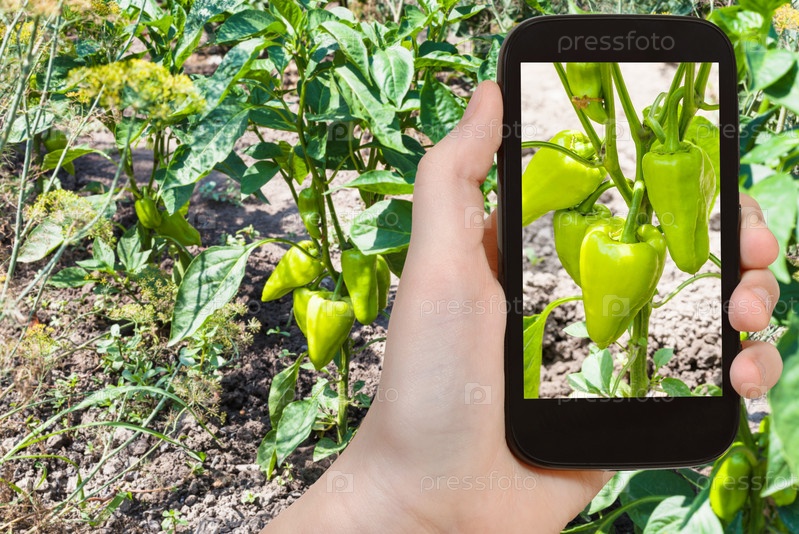 Турист фотографирует сладкий зеленый перец
