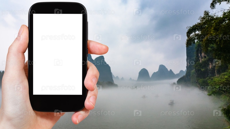 Турист фотографирует туман над рекой в Яншо