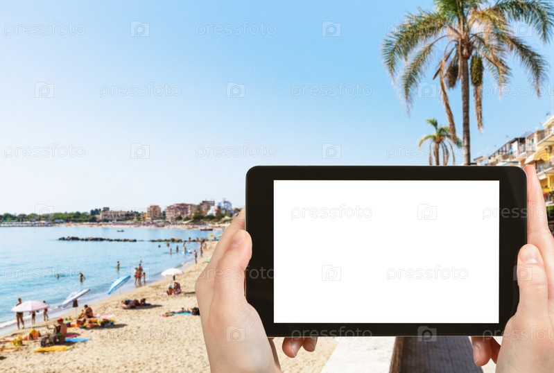 Турист фотографирует городской пляж в Джардини-Наксос