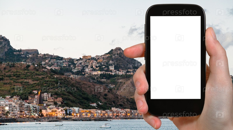 Турист фотографирует город Джардини-Наксос вечером